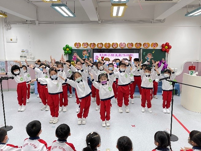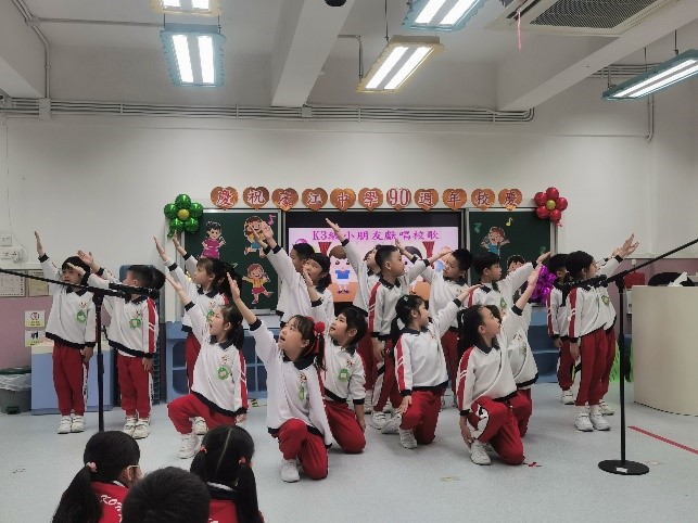 3月18日,K3年級全體學生,分成兩批在多功能室進行表演。來自K3A、K3D班的兩名小朋友主持了是次校歌表演活動。K3A班小朋友第一個出場, 歌聲鏗鏘有力,動力整齊劃一,為校歌表演帶來了開場小高潮。B班的小朋友不僅有歌唱,還結合了朗誦,詩情畫意,別出心裁。C班小朋友帶來了標語,祝福濠江生日快樂。D班還有紅旗、校訓道具,結合了舞臺表演,創意滿滿!E班小朋友隊形整齊,歌聲嘹亮。F班小朋友則童聲清唱,稚氣中充滿了感情。G班小朋友在結尾情深意切祝福母校生日快樂!簡短的校歌在每個班級的演繹中展現出了不同的風采。表演班班不同,但各具美感,美不勝收。