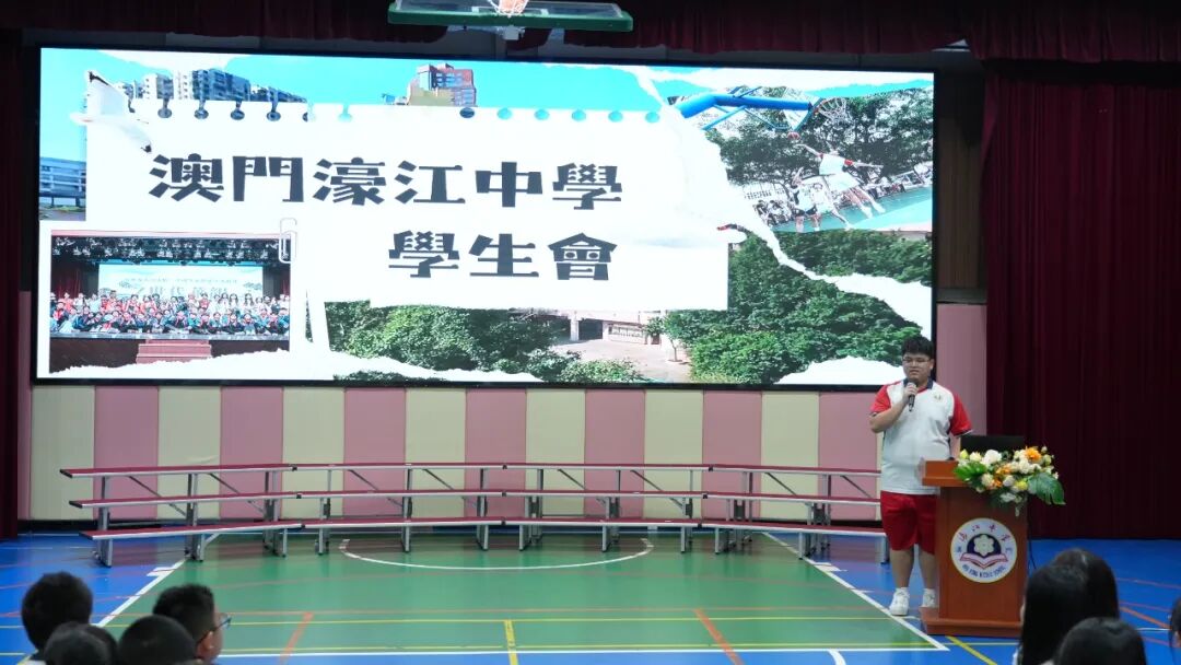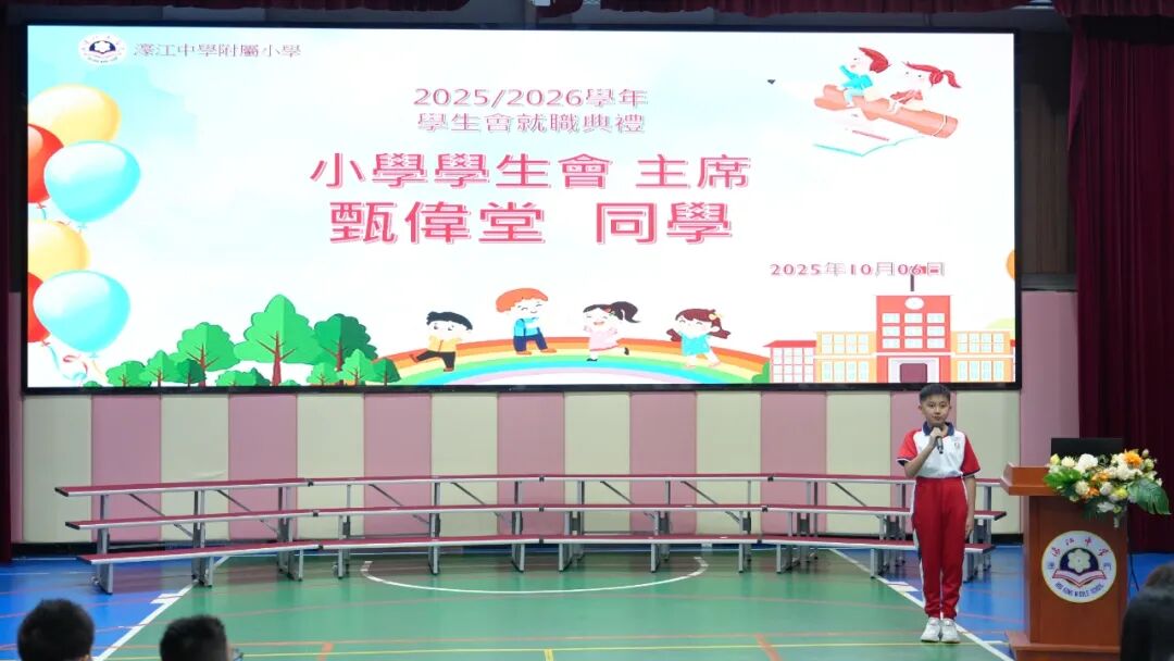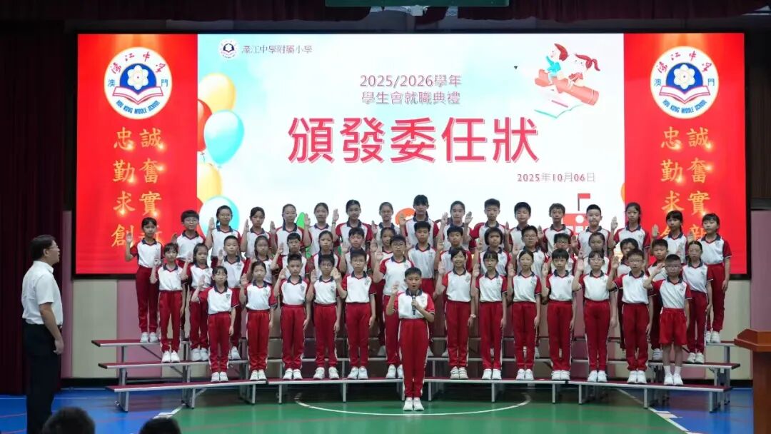 濠江中學附屬小學日前舉行 2025-2026 學年新一屆學生會就職典禮。本屆學生會共加入 50 餘名幹事,在濠江中學副校長陳步倩、中華學生聯合總會副監事長楊煒軒、升學及心理推廣部部長易碧玉,中學部學生會副主席鄭博瑋,小學學生會輔導老師胡杏珊,以及全校教職工與學生的共同見證下,全體幹事莊嚴宣誓就職,現場氣氛肅穆莊重,充滿對新學年的期待。