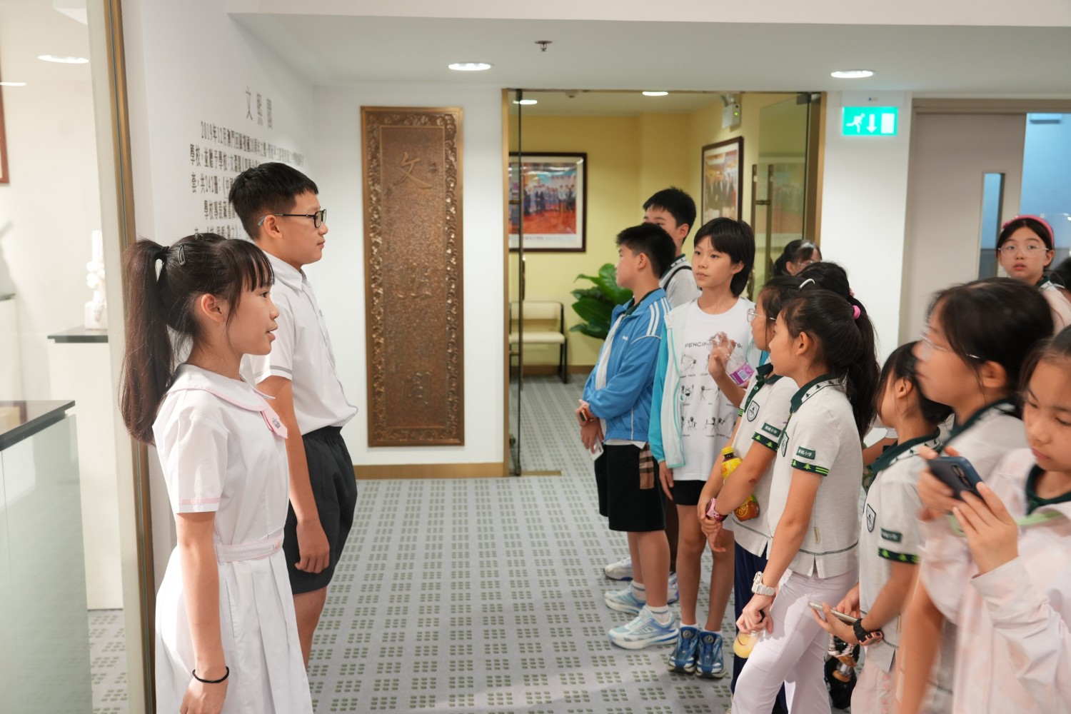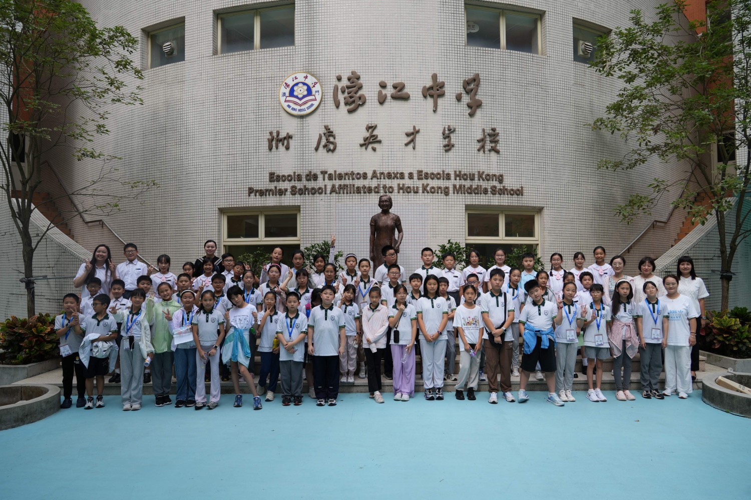 隨後,新城小學師生在學生會同學的引領下參觀了校園。學生會小導遊詳細介紹了校園佈局與學校特色,從富有文化氣息與設計感的校園設施到充滿活力的運動場地,新城小學師生對濠江英才有了更全面的了解。