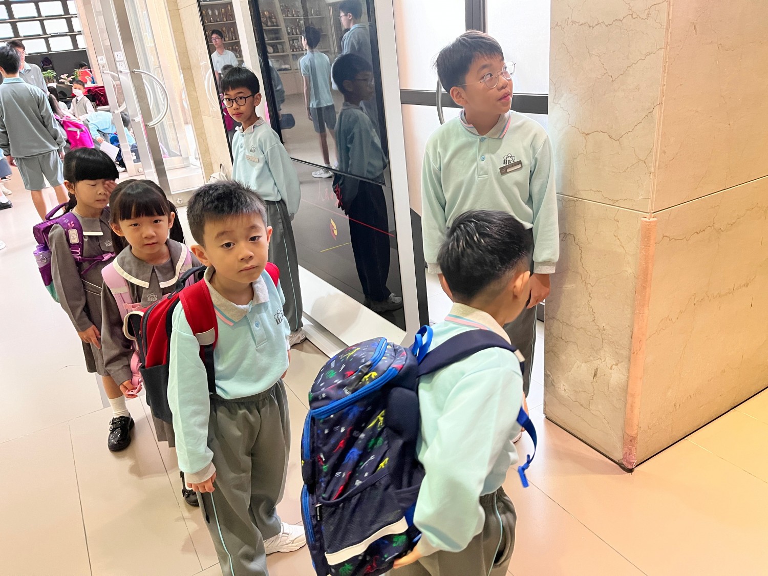 清晨,當一年級小朋友背著書包踏入校園時,總能在電梯口看到五六年級哥哥姐姐們那熟悉又溫暖的身影。哥哥姐姐們臉上掛著燦爛的笑容,主動和小朋友們打招呼,並耐心地幫助他們排隊,引導他們有序搭乘電梯。在電梯裏,哥哥姐姐們會溫柔地跟他們問好,幫他們按電梯,就像他們上學路上的一把“安心傘”。而一年級的小朋友們,也在這樣一次次的引領中,慢慢學會了如何有序排隊,如何禮貌地和他人打招呼,逐漸適應了校園的公共秩序。