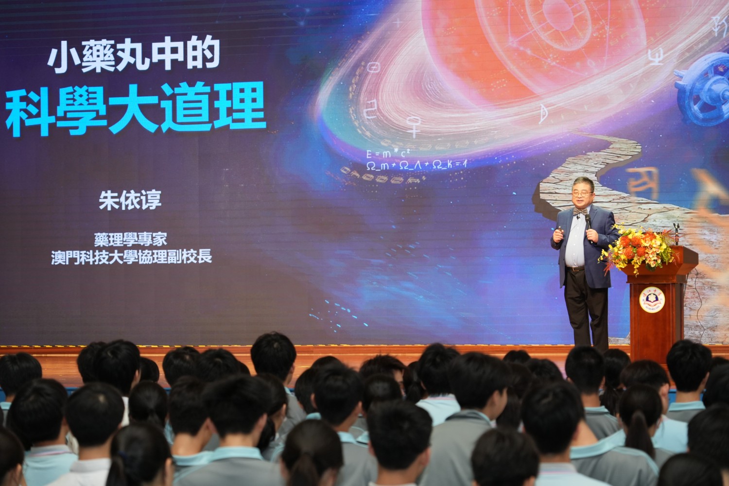 9月18日,由中國宋慶齡基金會主辦,澳門理工大學、國情教育(澳門)協會協辦的的“給孩子們的大師講堂”活動走進濠江中學附屬英才學校。本次活動邀請到國家重大研究計劃(973)首席科學家、歐洲科學與藝術院院士、澳門科技大學協理副校長、藥學院創院院長、澳門中華醫學會榮譽會長朱依諄先生蒞臨濠江英才,為同學們帶來一場聚焦學術前沿的專題講座——《小藥丸中的科學大道理》。