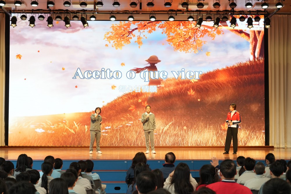 本次周會節目豐富多元,同學們以自製的葡語Vlog拉開序幕,用生活化視角展示語言學習成果;隨後的葡語歌曲演唱《Onde irei ter》、師生合作表演《O céu é infinito》及唱跳表演《À luz da lua》,以藝術形式傳遞了語言之美。英文演講圍繞“鼓勵學生參與體育運動”展開思辨,而別開生面的“葡英急口令挑戰”則將現場氣氛推向高潮,考驗了同學們的語言熟練度與反應能力。壓軸的澳門葡文知識問答環節,更是加深了全體同學對澳門本地文化特色與國際聯繫的理解。